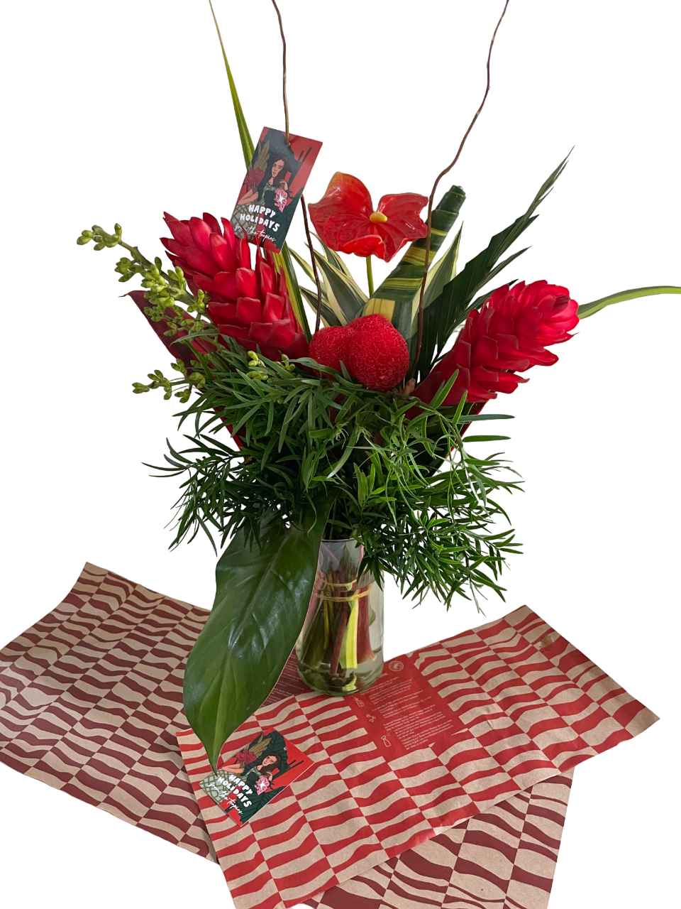 (1) Anthurium Tropical Red Large, (3) Cordelyne Leaves Fucsia, (1) Dracaena Sanderiana Bicolor, (1) Eucalyptus Doll cluster preserved Natural, (2) Ginger red, (1) Hel Iris Red, (1) Loafa Preserved sponges Red, (1) Palm Arrow Green, (1) Pandanus Curly, (2) Pandanus Variegated, (1) Phi. Esmeralda, (3) Podocarpus Green, (2) Willow