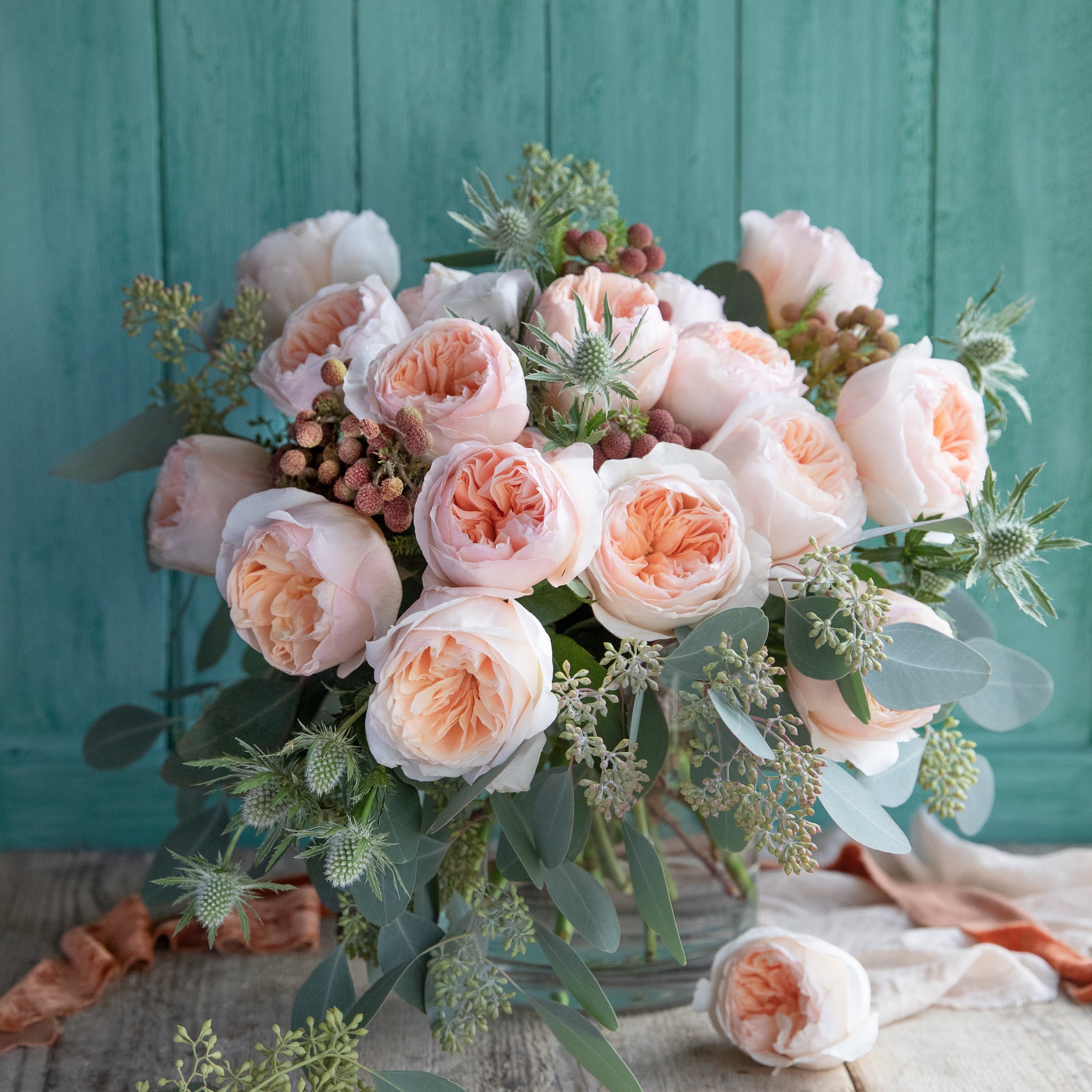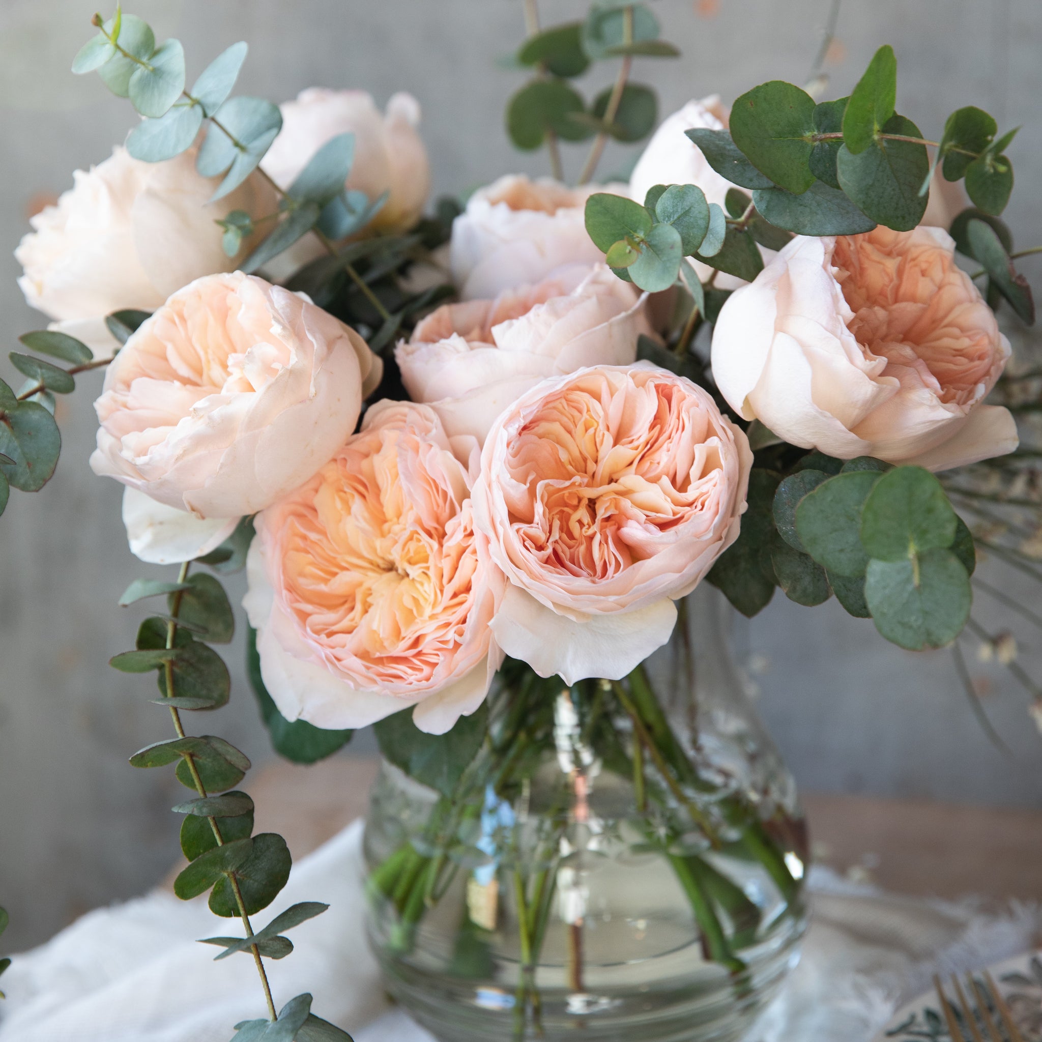 Bouquet of Juliet roses with a distinctive full cupped rose with voluminous petals, that ombré beautifully from soft peach to warm apricot.