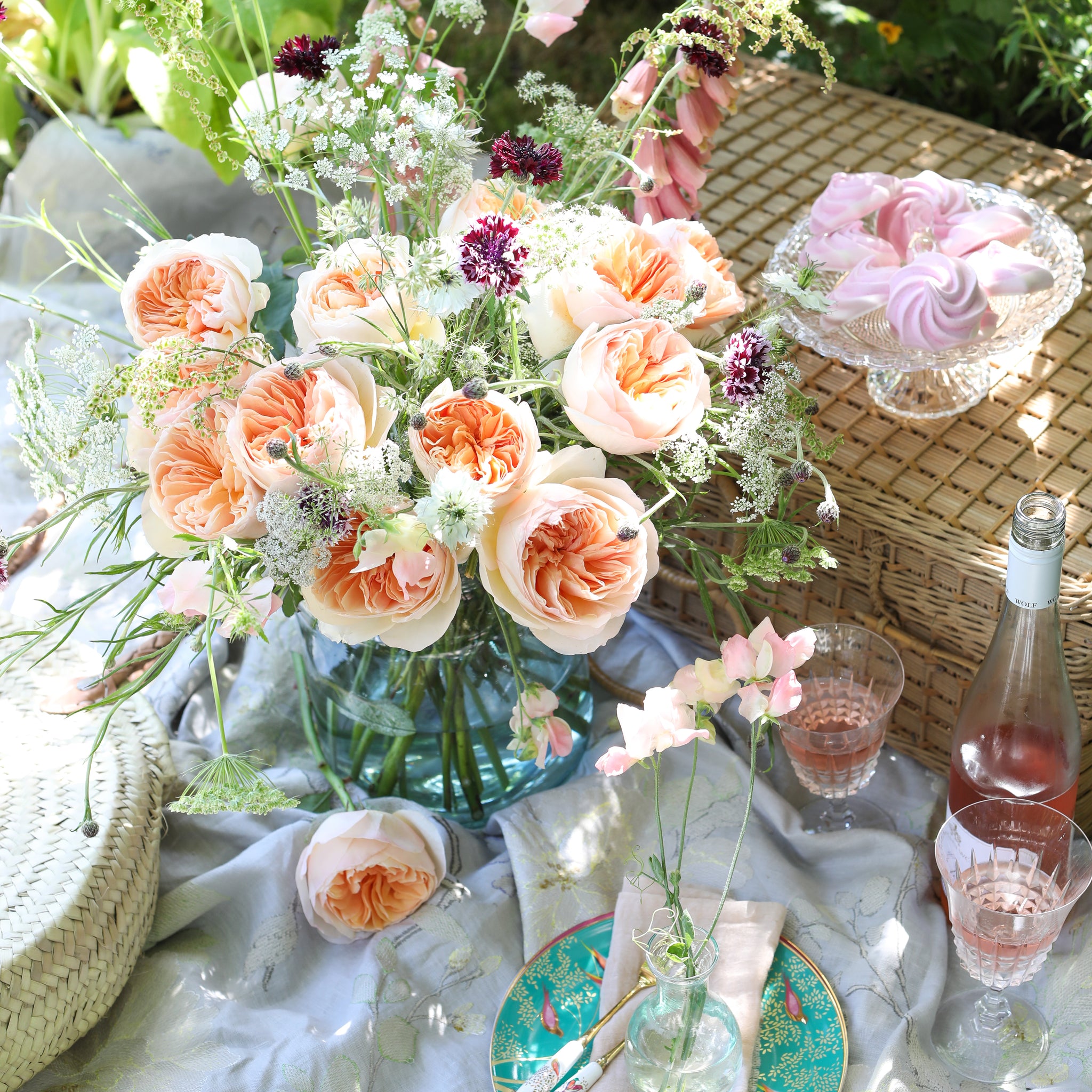 • Table setting with a bouquet of Juliet roses with a distinctive full cupped rose with voluminous petals, that ombré beautifully from soft peach to warm apricot.